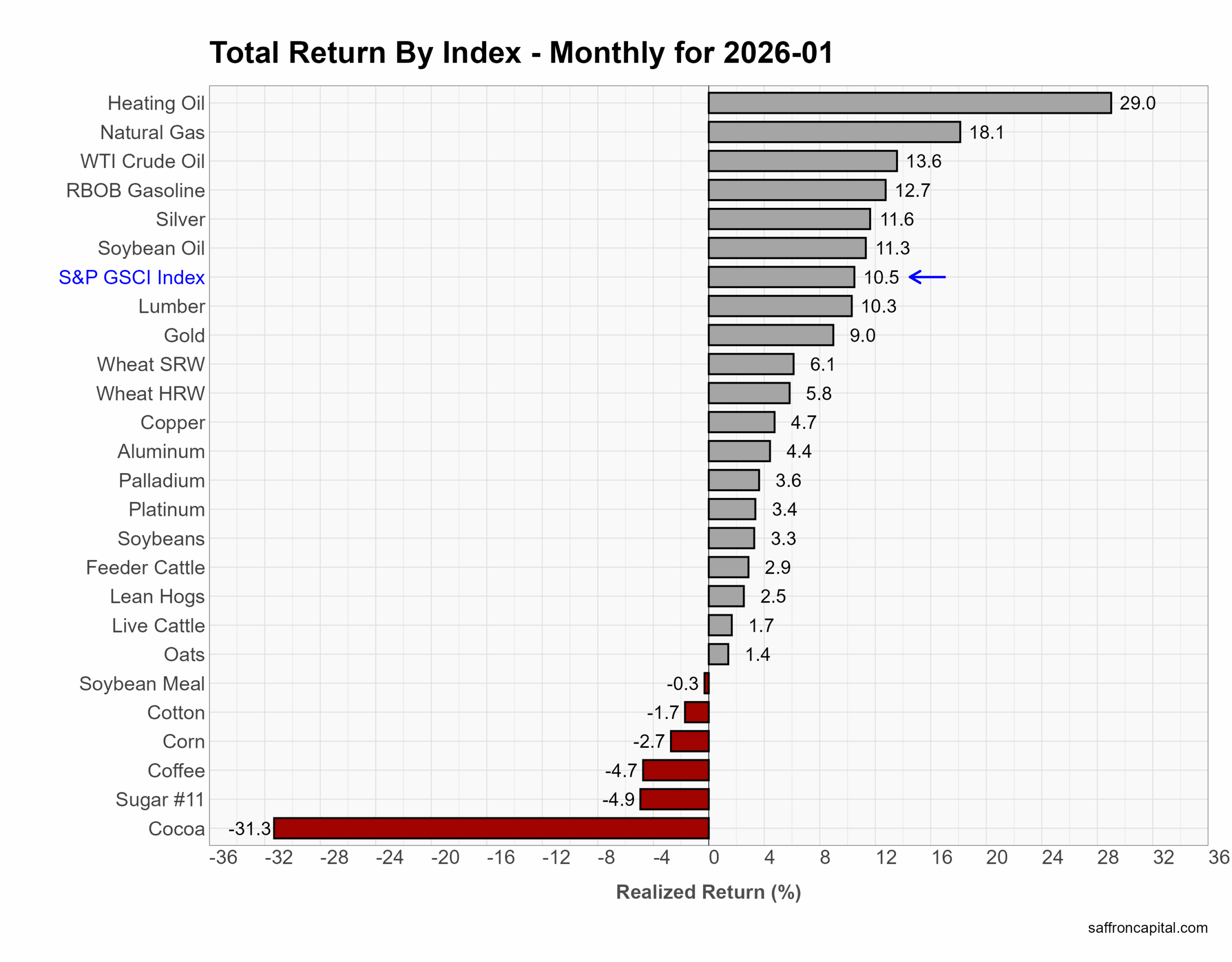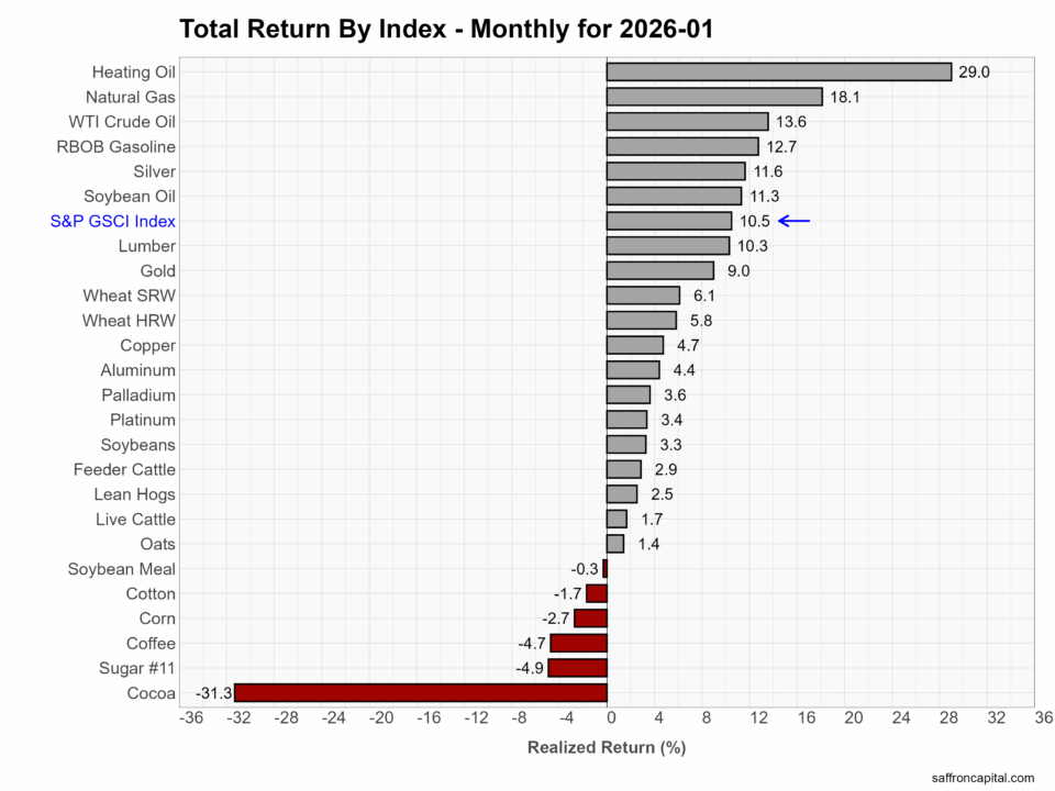 Commodity markets posted broad gains in January, with the S&P GSCI Index rising +10.5%, driven primarily by energy strength. For example, Heating oil (+29.0%), natural gas (+18.1%), WTI crude oil (+13.6%), and gasoline (+12.7%) led the complex, reflecting tight inventories and seasonal demand. Precious and industrial metals also advanced, with silver (+11.6%), gold (+9.0%), copper (+4.7%), and aluminum (+4.4%) contributing to upside momentum. Agricultural results were mixed: wheat posted moderate gains (6.1%), while corn (−2.7%), coffee (−4.7%), sugar (−4.9%), and cocoa (−31.3%) declined sharply following prior supply-driven rallies. January performance suggests traders remain positioned toward energy and metals, while agricultural commodities appear more vulnerable.