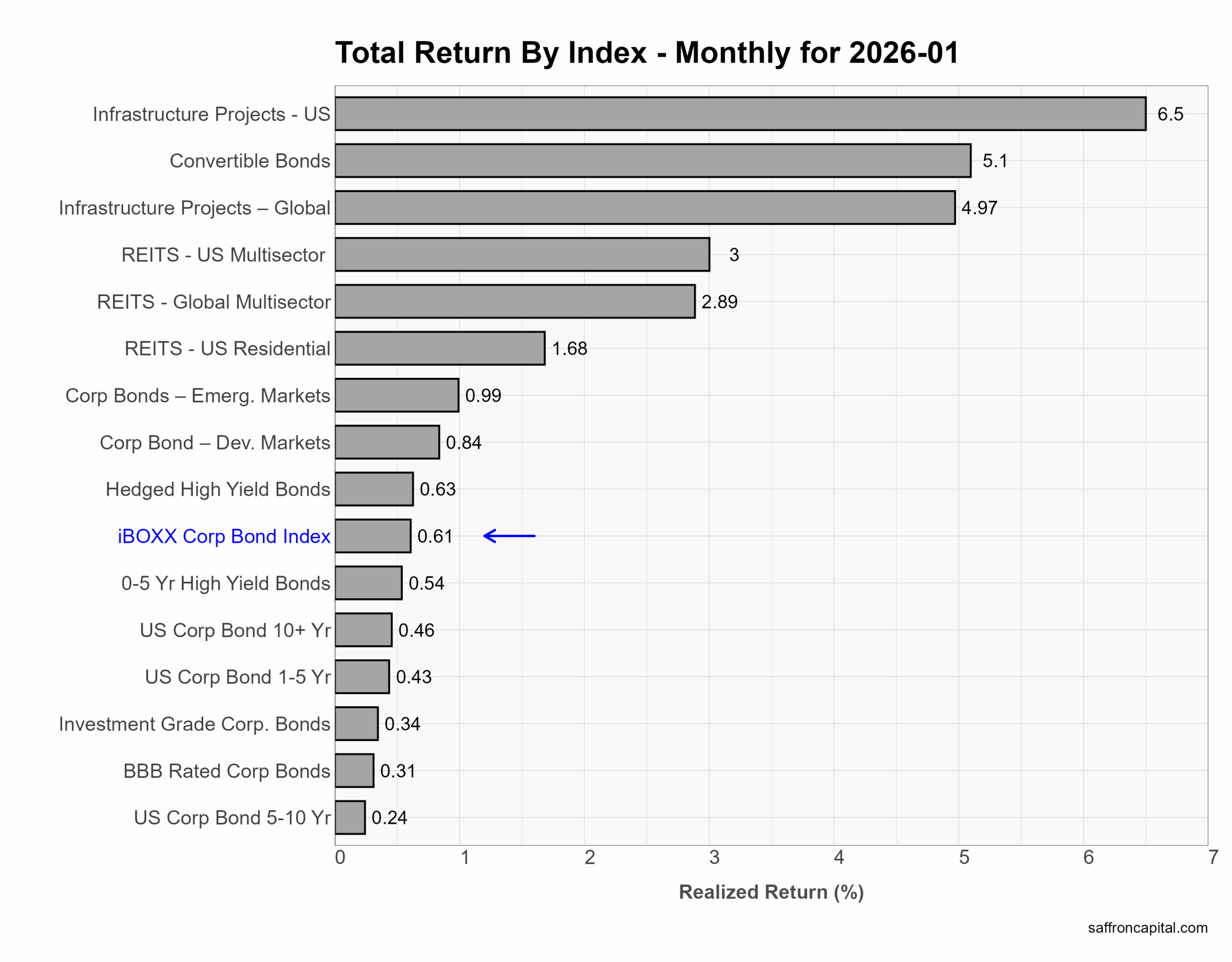 In January, credit and real-asset sectors delivered returns well above traditional corporate bonds. Infrastructure Project Bonds led performance, with U.S. projects up +6.5% and global projects up +5.0%, reflecting their linkage to long-term contracted cash flows and equity-like sensitivity during a strong risk-asset month. Convertible Bonds rose +5.1%, benefiting directly from rising equity prices while still carrying bond income characteristics. REITs also performed well, with U.S. multisector REITs up +3.0% and global REITs up +2.9%, rebounding alongside improving equity sentiment and stable financing conditions. By comparison, the iBOXX Corporate Bond Index gained just +0.61%, constrained by higher duration exposure and limited spread compression. January results highlight that hybrid and real-asset credit sectors can materially outperform traditional corporate bonds during periods of improving risk appetite, though they carry higher volatility and equity sensitivity.