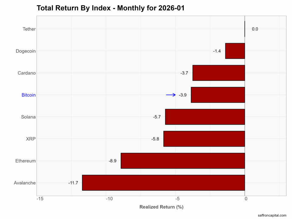 Crypto markets broadly declined in January, with losses concentrated in higher-beta tokens. Bitcoin fell −3.9%, while Ethereum dropped −8.9%, and larger drawdowns hit Avalanche (−11.7%), Solana (−5.7%), and XRP (−5.8%), reflecting a pullback after strong prior gains. Market data show profit-taking across altcoins and reduced risk appetite, with capital rotating out of more volatile projects first. Stablecoins such as Tether were unchanged, underscoring the defensive shift. January price action suggests investors favored liquidity and caution, with speculative crypto assets lagging as volatility rose and momentum cooled.