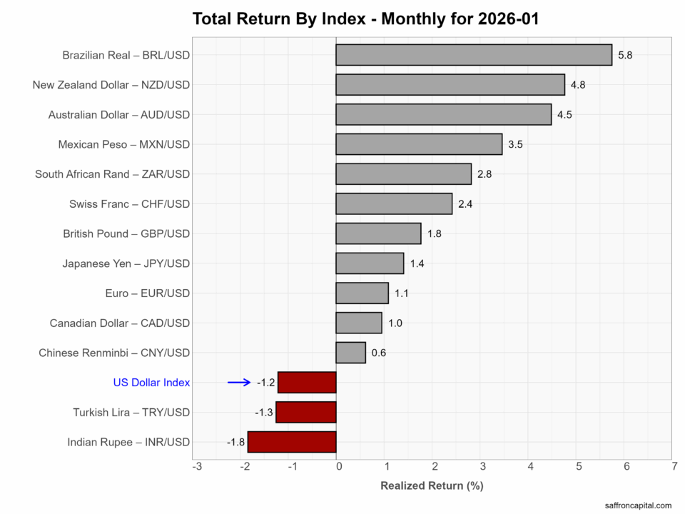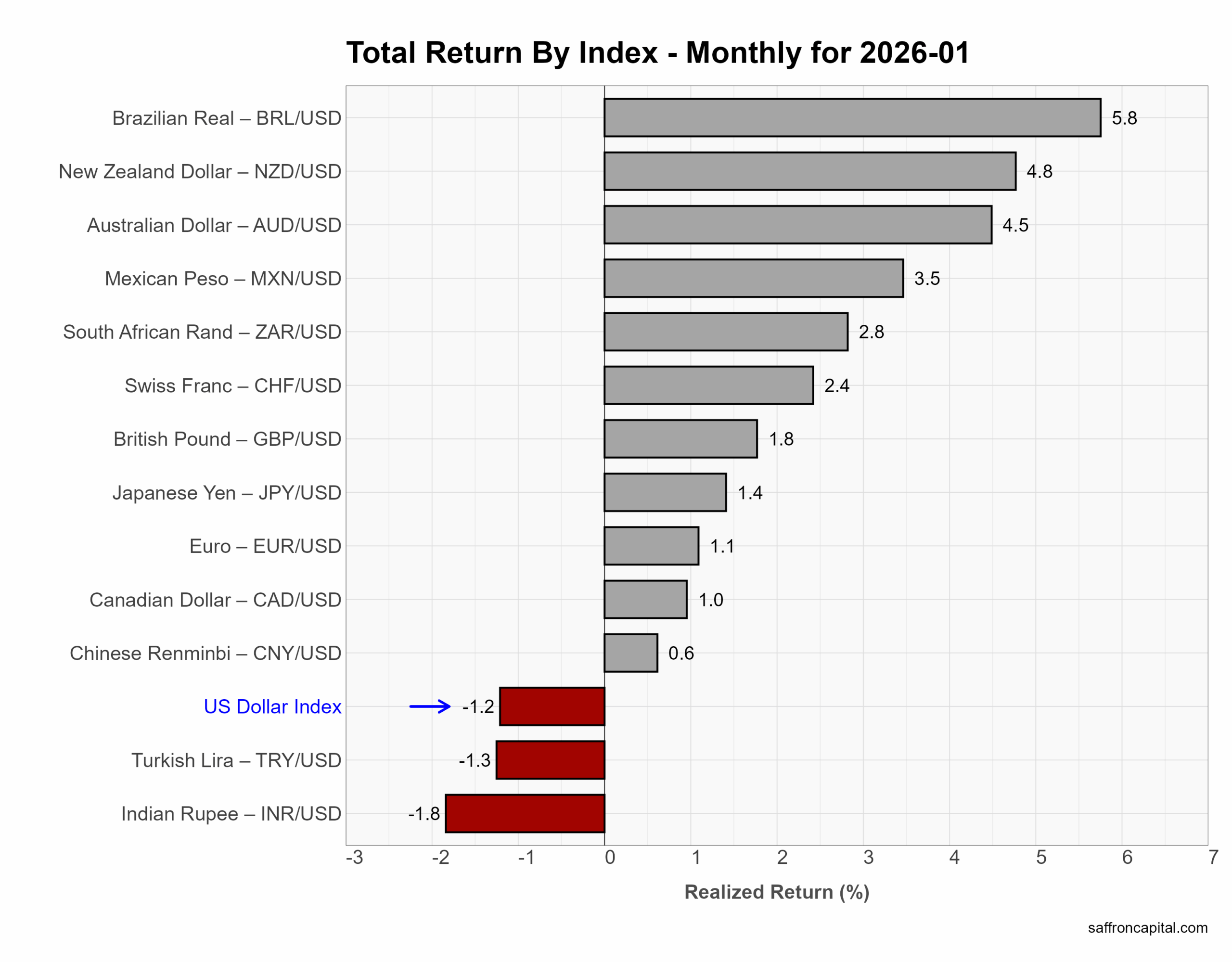 Currency markets in January reflected broad U.S. dollar weakness, with the U.S. Dollar Index down −1.2%. Commodity-linked currencies led gains, including the Brazilian real (+5.8%), New Zealand dollar (+4.8%), and Australian dollar (+4.5%), moving higher alongside strong commodity prices. The Mexican peso (+3.5%) and South African rand (+2.8%) also benefited from improved risk sentiment. Major developed currencies posted modest gains, with the euro (+1.1%), yen (+1.4%), and pound (+1.8%) all strengthening versus the dollar. In contrast, the Indian rupee (−1.8%) and Turkish lira (−1.3%) lagged due to country-specific policy and inflation pressures.