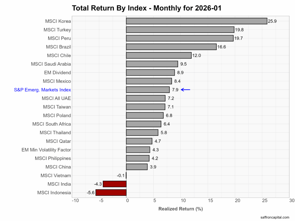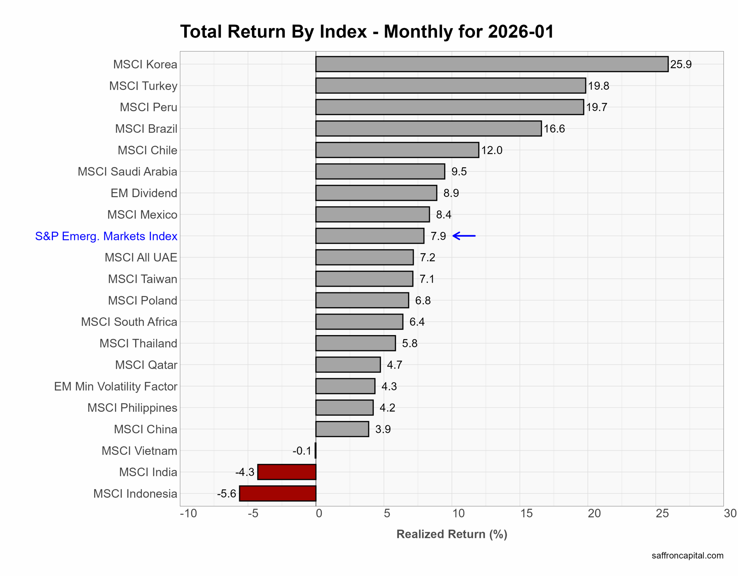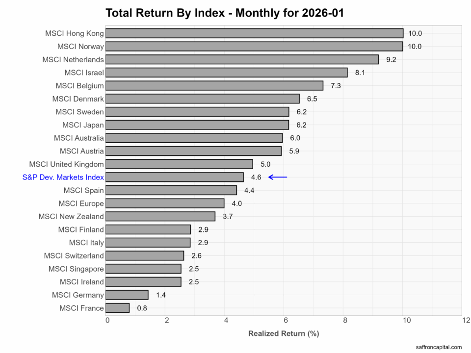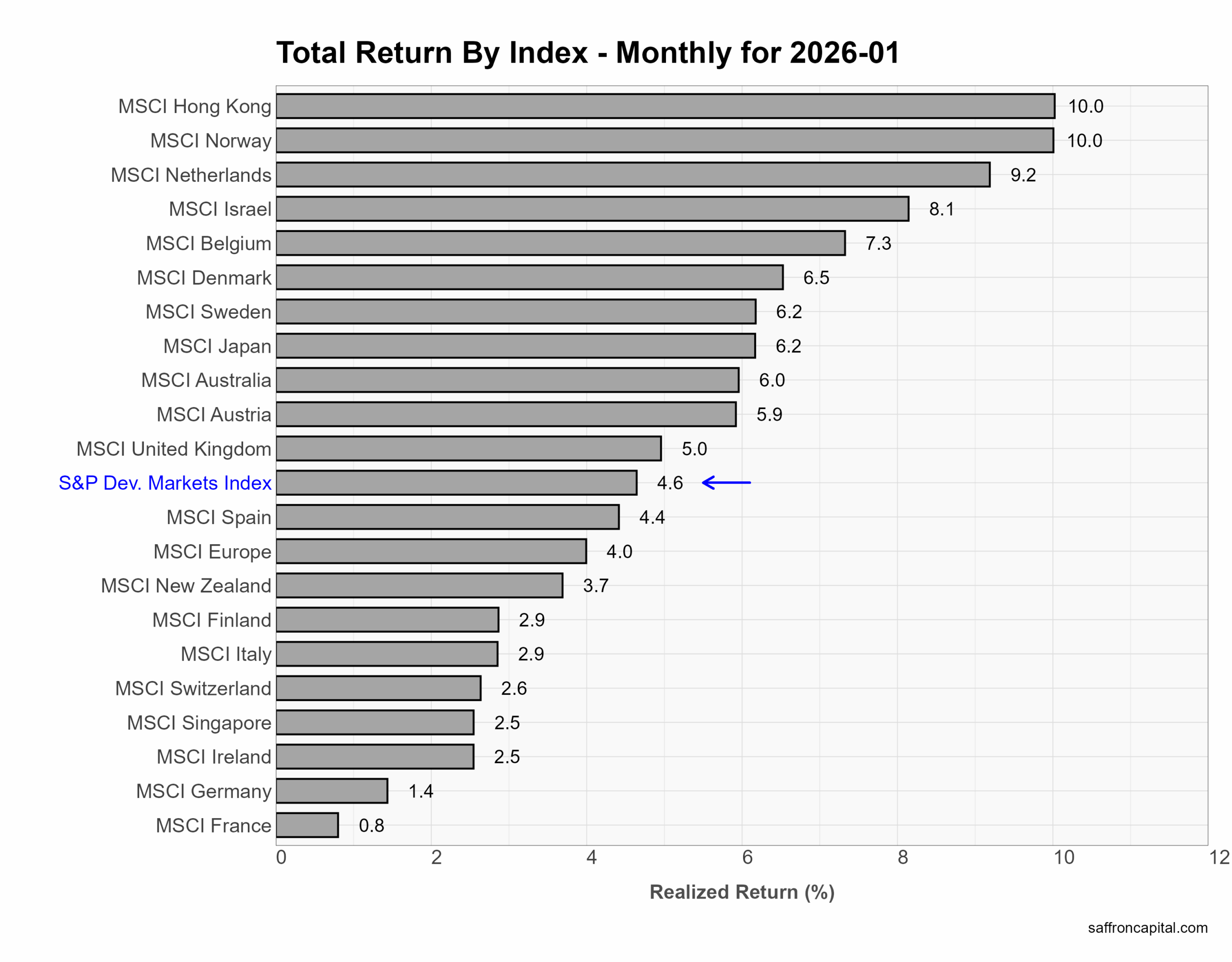 Emerging market equities start 2026 with solid gains, supported by improving global growth expectations and a more stable interest-rate backdrop. Hong Kong (+10.0%) and Norway (+10.0%) led the group, reflecting heavy index exposure to Financials, Energy, and Materials, which were among the strongest global sectors during the month. The Netherlands (+9.2%) and Israel (+8.1%) also performed well, supported by Technology, Industrials, and defense-related companies. Broad European markets delivered solid but more moderate gains, with Europe up +4.0% overall, while Germany (+1.4%) and France (+0.8%) lagged due to weaker performance in Industrials and Consumer sectors. The S&P Developed Markets Index rose +4.6%, significantly outperforming the S&P 500 (+1.4%). Early 2026 continues the 2025 pattern of stronger returns outside the U.S., driven by sector mix and broader market participation rather than U.S. mega-cap concentration.