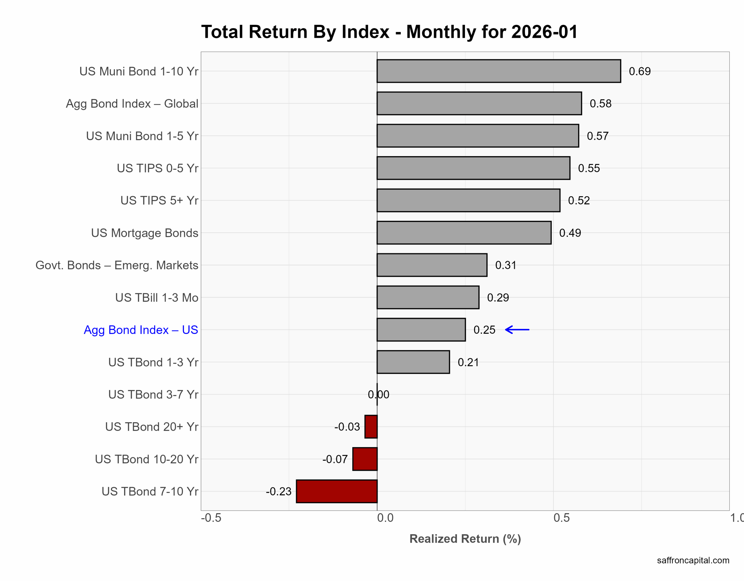 January returns for government bond were driven by yield-curve positioning, with the front end outperforming longer maturities. The US Aggregate Bond Index rose +0.25%, supported by gains in short-duration and spread sectors. Municipal bonds led performance, with 1–10Y munis up +0.69% and 1–5Y munis up +0.57%, reflecting shorter duration and attractive tax-adjusted yields. TIPS posted solid gains across maturities, with 0–5Y TIPS up +0.55% and 5Y+ TIPS up +0.52%, consistent with stable real yields and ongoing demand for inflation protection. Longer-dated Treasuries lagged, with 7–10Y Treasuries down −0.23%, 10–20Y Treasuries down −0.07%, and 20Y+ Treasuries slightly negative at −0.03%. January results continue to favor short- and intermediate-term bonds for income with lower duration risk.