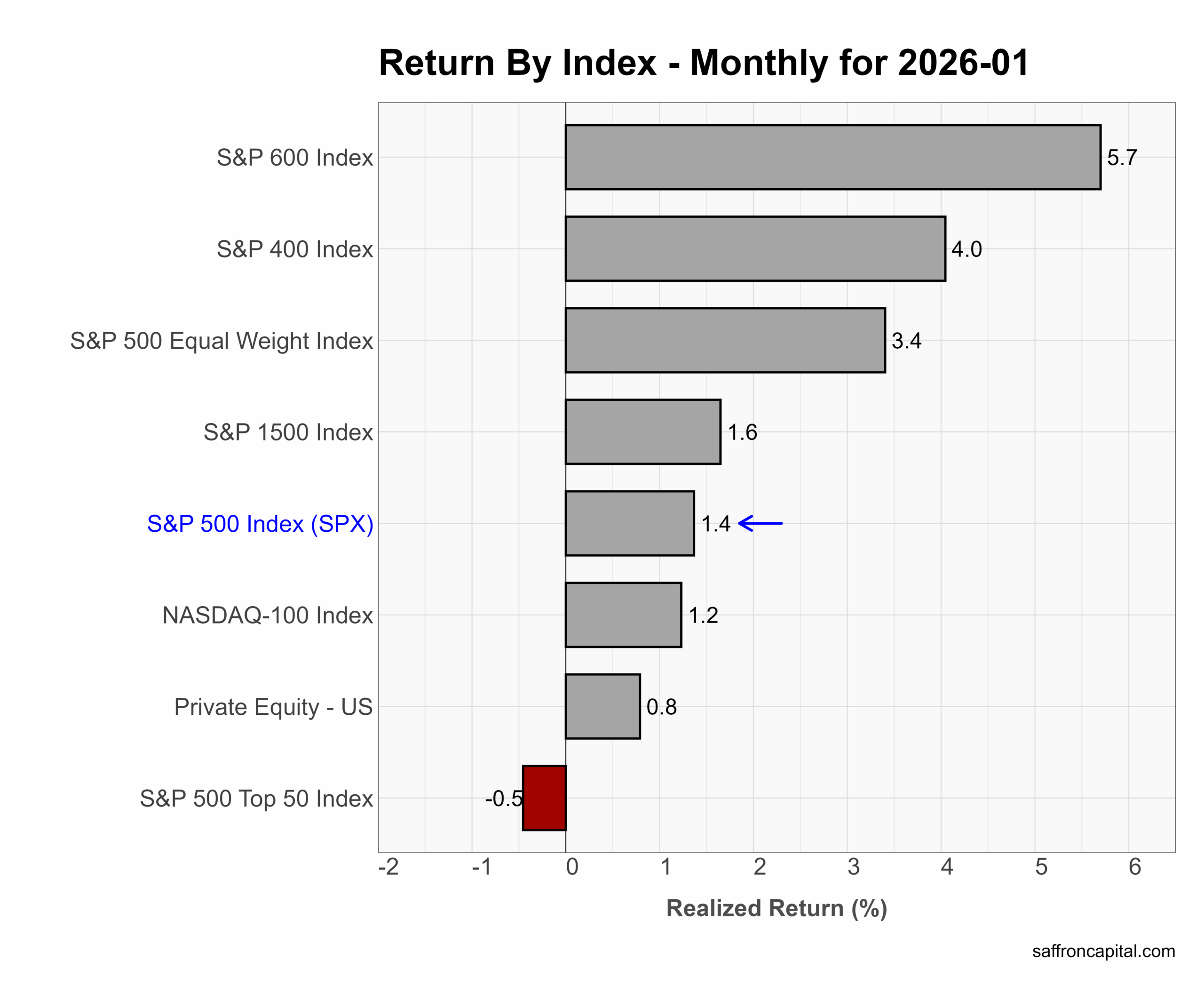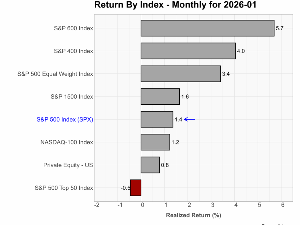 U.S. equities delivered broad-based January returns, led by a clear rotation into small- and mid-cap stocks. The S&P 600 Small Cap Index surged +5.7% and the S&P 400 Mid Cap Index gained +4.0%, materially outperforming large-cap benchmarks. The S&P 500 Equal Weight Index rose +3.4%, more than doubling the return of the cap-weighted S&P 500 Index (+1.4%), highlighting improving market breadth. By contrast, mega-cap leadership faded, with the NASDAQ-100 up just +1.2% and the S&P 500 Top 50 Index declining −0.5%. Rotation reflected resilient U.S. growth data, easing recession risk, and attractive relative valuations in cyclicals and domestically oriented companie.