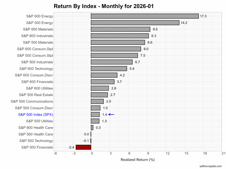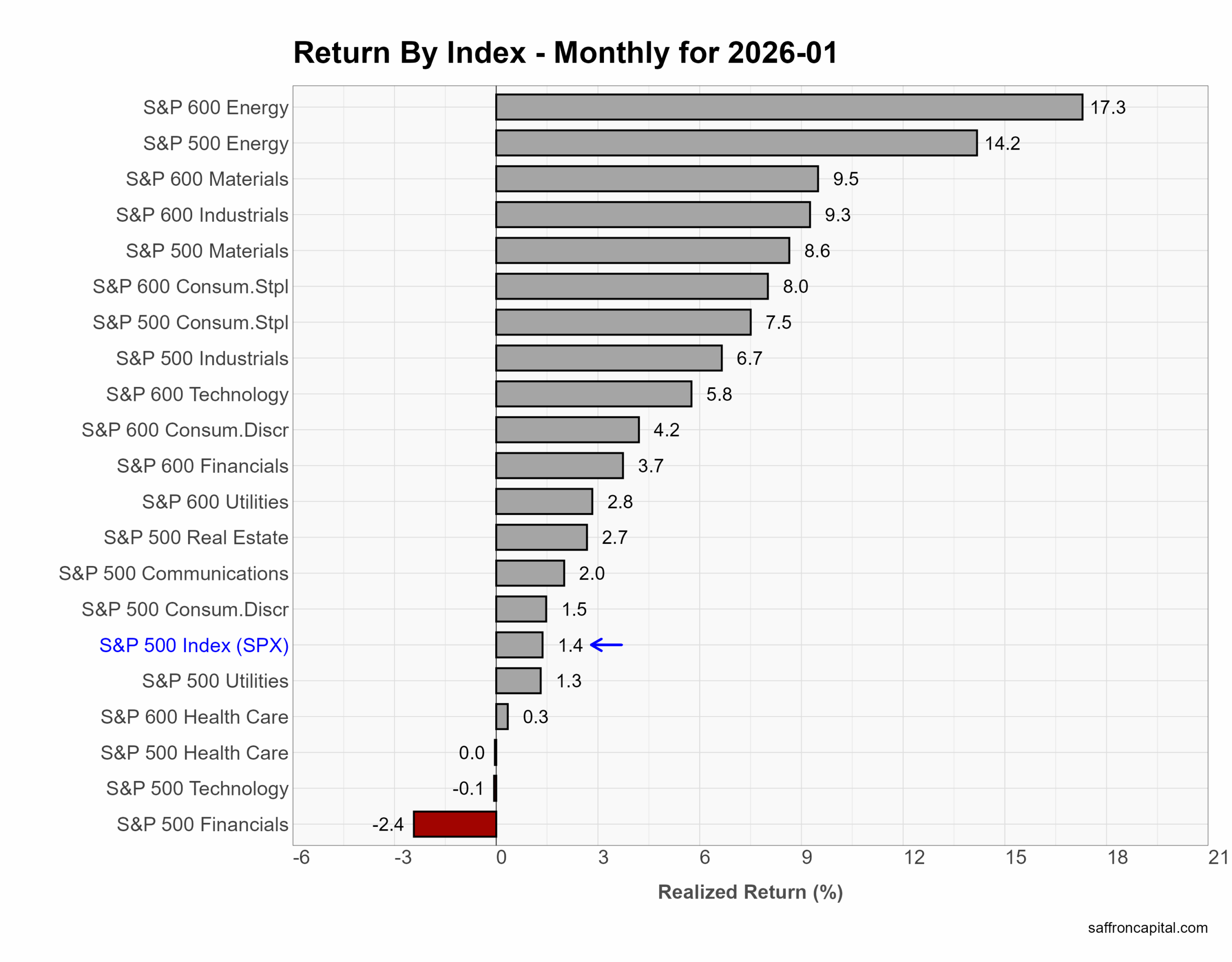 January returns by sector were led by Energy and Materials, with small-cap Energy (+17.3%) and large-cap Energy (+14.2%) posting outsized gains amid higher oil prices, tighter global supply conditions, and renewed geopolitical risk premia. Materials also performed across market caps, supported by infrastructure spending, industrial metals demand, and improving global manufacturing sentiment. Industrials and Consumer Staples delivered solid gains, reflecting resilient domestic growth and steady demand. Technology lagged broader cyclicals, particularly in large caps, as investors rotated toward more economically sensitive sectors and away from crowded growth trades. Financials underperformed in January as yield-curve dynamics and margin pressures weighed on bank earnings outlooks. Health Care was largely flat, reflecting limited earnings catalysts and ongoing policy uncertainty.