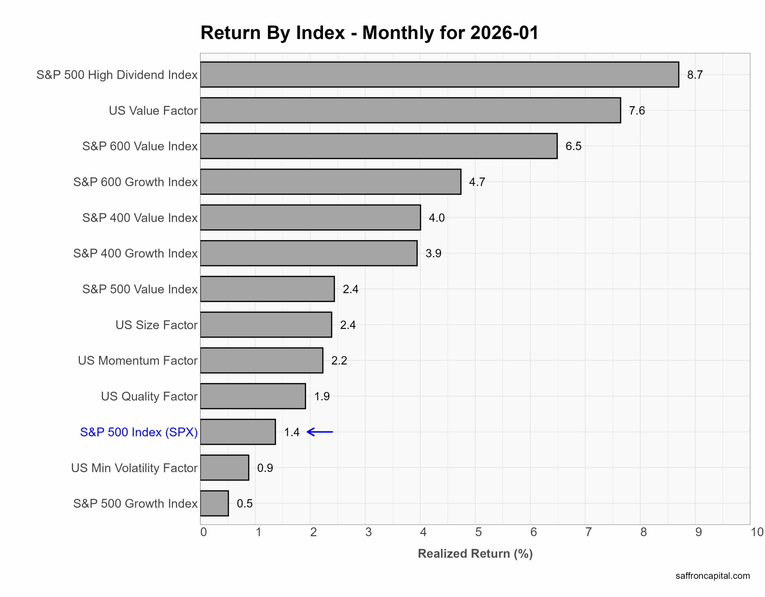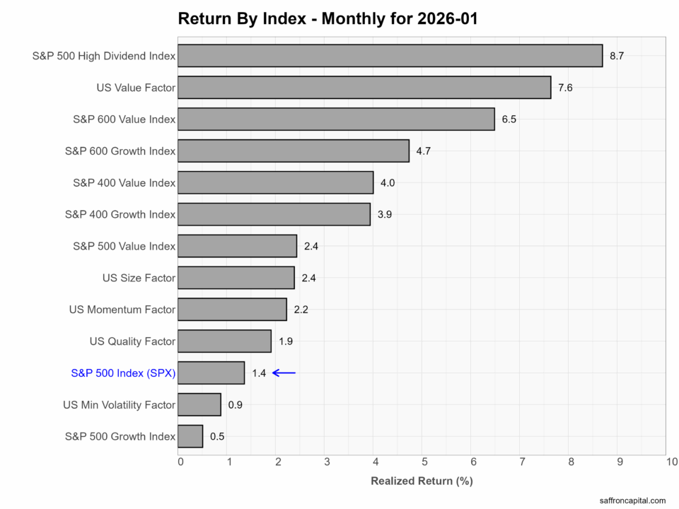 Factor portfolios are designed to isolate the specific drivers of equity returns, such as valuation, income, momentum, quality, and volatility. These model portfolios help investors understand what types of company characteristics are being rewarded in a given market environment. January returns show that ZHigh Dividends (+8.7%) and the Value factor (+7.6%) significantly outperformed the S&P 500 index. Returns reflected rising cash-flow sensitivity, rewarding lower value companies with stable earnings expectations, and supporting investor demand for income amid macro uncertainty. The US Momentum (+2.2%) and Quality (+1.9%) factors posted modest gains, while Growth (+0.5%) lagged, as elevated valuations limited upside. Overall, factor performance in January signaled a market favoring cash generation, valuation discipline, and defensive income characteristics over pure growth exposure.