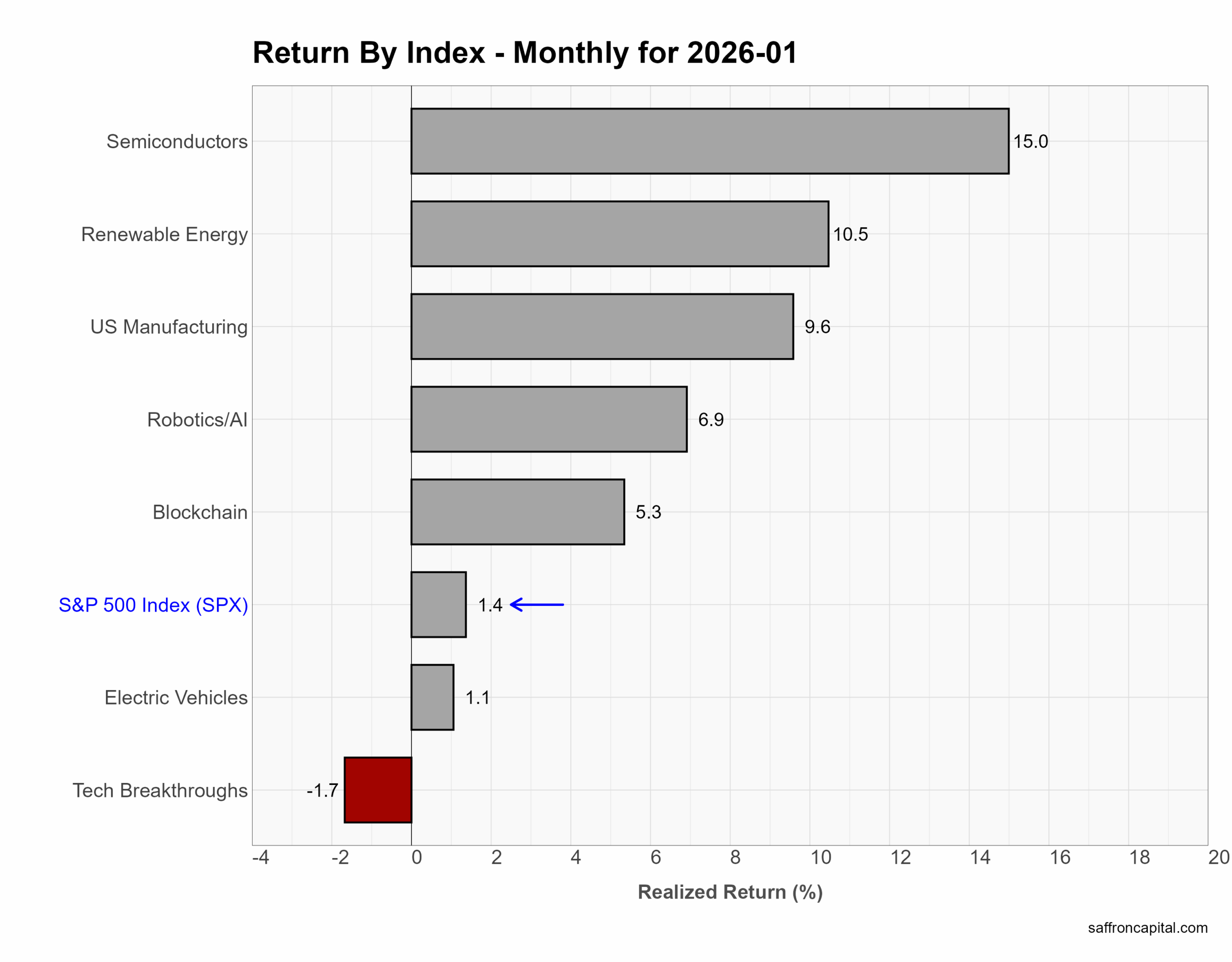 US thematic portfolios delivered strong gains in January, led by Semiconductors (+15.0%), Renewable Energy (+10.5%), and US Manufacturing (+9.6%). Semiconductor performance reflected continued AI-driven capital spending, improving memory pricing, and resilient demand for advanced logic chips. Renewable Energy rebounded as investors priced in supportive policy signals, easing financing conditions, and accelerating grid and storage investment. US Manufacturing benefited from stabilizing global PMIs, reshoring momentum, and increased infrastructure-related orders. Robotics/AI (+6.9%) advanced alongside semiconductors, supported by enterprise automation and productivity investment. Blockchain shares (+5.3%) recovered as digital asset prices firmed and regulatory clarity improved. Electric Vehicles (+1.1%) lagged broader themes amid pricing pressure and margin concerns, while Tech Breakthroughs (-1.7%) underperformed as speculative growth cooled and investors favored nearer-term cash flow visibility.