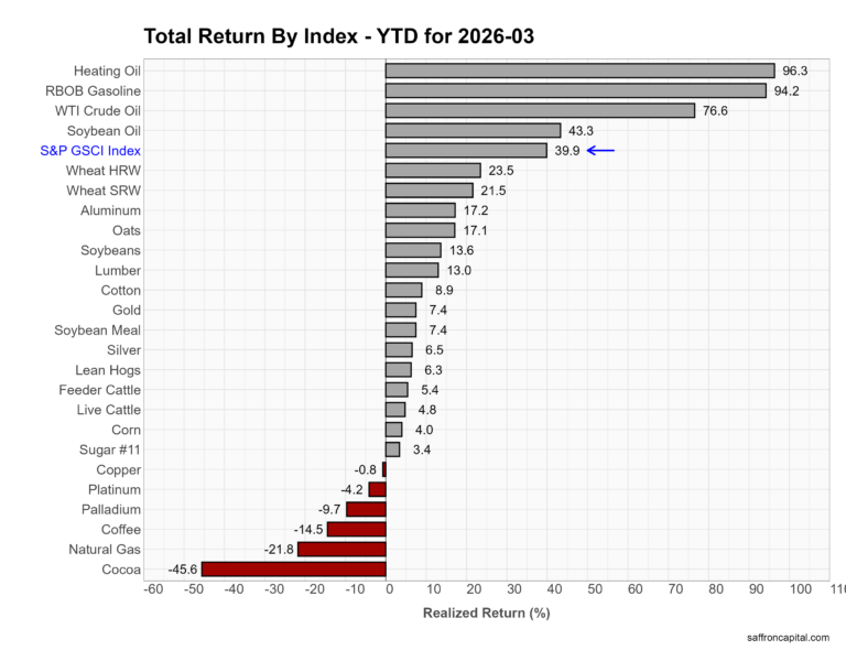 March was dominated by energy. The S&P GSCI surged 24.2%. RBOB gasoline jumped 59.4%, heating oil 55.9%, and WTI crude 51.3%. Agriculture was broadly higher, led by cocoa (+17.9%) and grains/oils in the low double digits. In contrast, metals lagged. Gold fell 11.1%, copper dropped 6.9%, and silver plunged 19.4%. Overall, a sharp energy rally drove the complex.