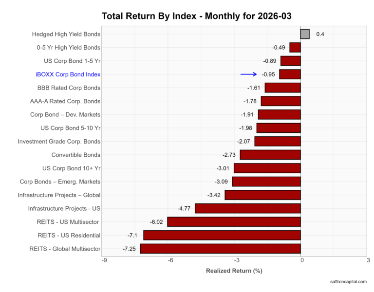 March hit rate-sensitive income assets as yields moved higher. First, REITs led the downside. Global REITs fell -7.25%, and US Residential REITs dropped -7.1%, while US Multisector REITs declined -6.02%. Infrastructure also pulled back, with US projects down -4.77% and global projects off -3.42%. Core credit held up better but still lost ground. The iBOXX Corporate Bond Index fell -0.95%, with investment grade at -2.07% and 10+ year corporates down -3.01%. In contrast, hedged high yield gained +0.4%, showing resilience in shorter-duration, spread-driven credit. Overall, rising rates pressured duration-heavy income sectors despite stable credit spreads.