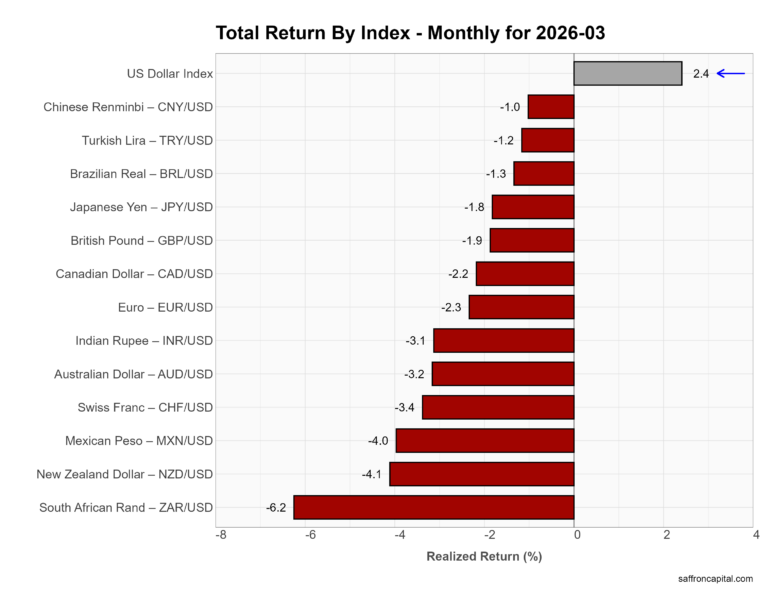 March saw broad dollar strength. The US Dollar Index rose 2.4%. Most currencies weakened, led by the South African rand (-6.2%), New Zealand dollar (-4.1%), and Mexican peso (-4.0%). The euro (-2.3%), pound (-1.9%), and yen (-1.8%) also declined. Overall, higher US yields and risk-off tone supported the dollar.