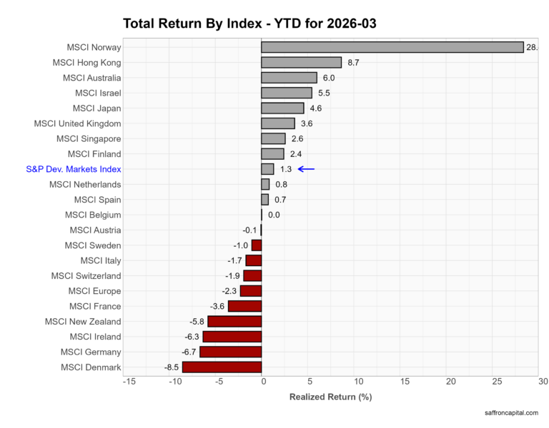 March returns show developed markets underperforming the U.S. First, the S&P Developed Markets Index fell -7.8%, lagging the S&P 500 at -5.1%. Losses were broad across Europe and Asia. Germany dropped -10.5%, France -9.4%, and Japan -8.6% as global growth fears and higher rates pressured equities. The U.K. declined -6.4%, while Australia fell -7.7%. Norway stood out as the lone gainer, rising +7.2% on energy strength. Overall, developed markets showed deeper downside sensitivity to the global macro shock than the U.S.