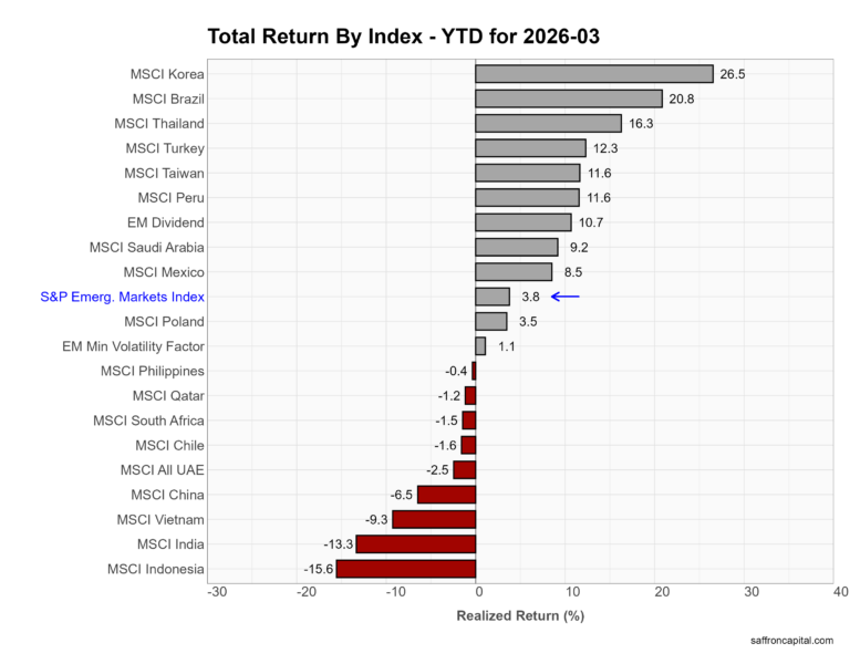 Year to date, performance remains mixed with pockets of strength. Korea leads at +26.5%, followed by Brazil (+20.8%) and Thailand (+16.3%), supported by commodities and export momentum. Taiwan and Peru are both up +11.6%, while Saudi Arabia gained +9.2%. The S&P Emerging Markets Index sits at +3.8%. However, several markets lag, with Indonesia (-15.6%), India (-13.3%), and Vietnam (-9.3%) in negative territory. Overall, 2026 rewards select exporters and commodity-linked economies, while domestic-demand stories struggle.