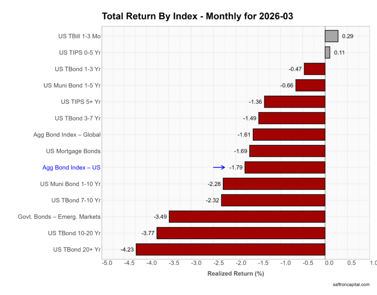 Year to date, returns are flat to modest despite March losses. 0–5 Year TIPS lead at +1.02%, followed by T-bills at +0.86%. Mortgage bonds and longer TIPS are up about +0.4%, while most Treasury maturities hover near zero or slightly negative. The US Aggregate Bond Index sits at +0.02%, reflecting limited carry offsetting price declines. In short, 2026 favors short duration and inflation protection over long-duration exposure.