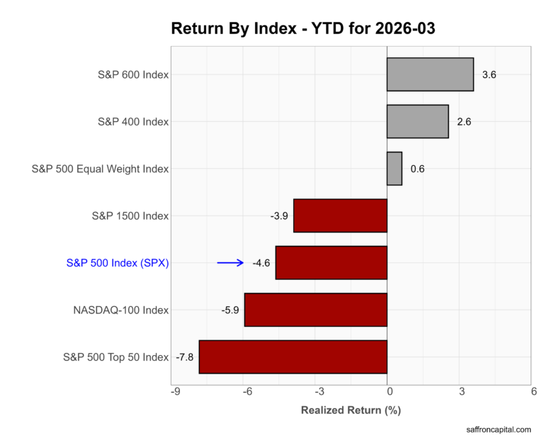 Year to date, leadership still leans toward smaller caps despite the March drawdown. The S&P 600 leads at +3.6%, followed by the S&P 400 at +2.6%, while the Equal Weight S&P 500 remains positive at +0.6%. In contrast, large-cap benchmarks lag. The S&P 500 sits at -4.6%, the NASDAQ-100 at -5.9%, and the S&P 500 Top 50 trails at -7.8%. Overall, 2026 still reflects a shift away from mega-cap concentration toward broader, more balanced market participation—even after March’s reset.