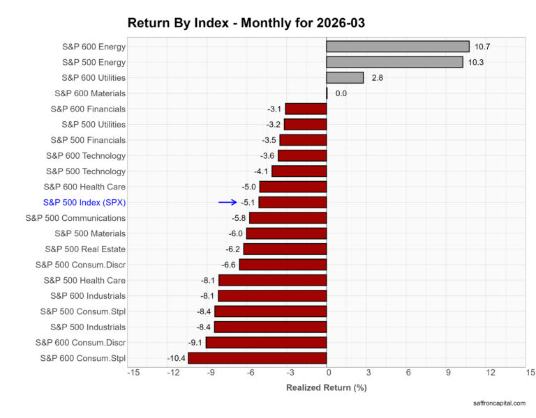 March delivered a broad-based equity selloff with no place to hide. First, mega caps led to the downside as the NASDAQ-100 fell -4.8% and the S&P 500 Top 50 dropped -4.3%. Meanwhile, the S&P 500 declined -5.1%, and broader indices performed even worse. The S&P 400 lost -5.3%, the S&P 600 fell -4.0%, and the Equal Weight S&P 500 dropped -6.0%, which confirms that weakness extended well beyond Big Tech. In short, March erased the prior rotation into breadth and reset risk across the entire equity complex.