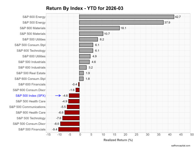 March reinforced a hard rotation into energy and away from growth. First, Energy led decisively, with S&P 500 Energy up +10.3% and small-cap Energy gaining +10.7% as crude prices surged. Utilities followed with modest gains (+2.8% in small caps), reflecting a partial defensive bid. However, the rest of the market sold off sharply. Cyclicals lagged, with Industrials down -8.4% and Consumer Staples off -8.4% in large caps. Growth sectors also struggled. Technology fell -4.1%, Communication Services dropped -5.8%, and Consumer Discretionary declined -6.6%. Financials weakened (-3.5%) as rate volatility and credit concerns pressured sentiment. Overall, March showed a narrow leadership profile dominated by energy, with broad weakness elsewhere.