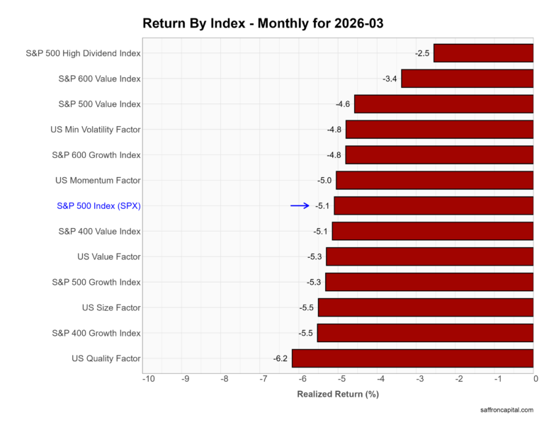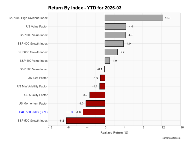 Factor portfolios group stocks by shared characteristics such as value, growth, momentum, or income to isolate specific return drivers. In March, all major factors declined, which signals broad de-risking rather than rotation. First, defensive strategies held up best. The S&P 500 High Dividend Index fell just -2.5%, outperforming the broader market. Meanwhile, Value showed relative resilience, with large-cap Value down -4.6% versus -5.3% for Growth. However, higher-beta exposures lagged. Momentum dropped -5.0%, Size fell -5.5%, and Quality underperformed at -6.2%. In short, investors reduced risk across both growth and factor tilts, with only income strategies offering partial downside protection.