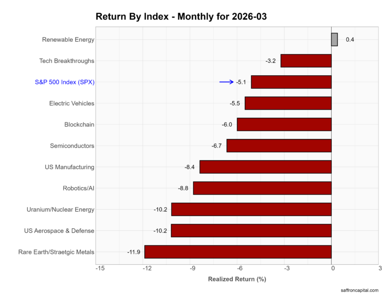 Thematic portfolios group stocks around structural trends—such as energy transition, AI, or supply chain security—rather than traditional sectors. In March, performance skewed defensive and commodity-linked. Renewable Energy held flat (+0.4%), outperforming a weak tape. However, most themes sold off sharply. Semiconductors fell -6.7%, Blockchain dropped -6.0%, and Electric Vehicles declined -5.5% as investors reduced exposure to growth and innovation trades. More cyclical and industrial themes lagged further. US Manufacturing lost -8.4%, Robotics/AI fell -8.8%, and Uranium/Nuclear Energy dropped -10.2%. Rare Earth/Strategic Metals led declines at -11.9%, reflecting profit-taking after strong prior gains.