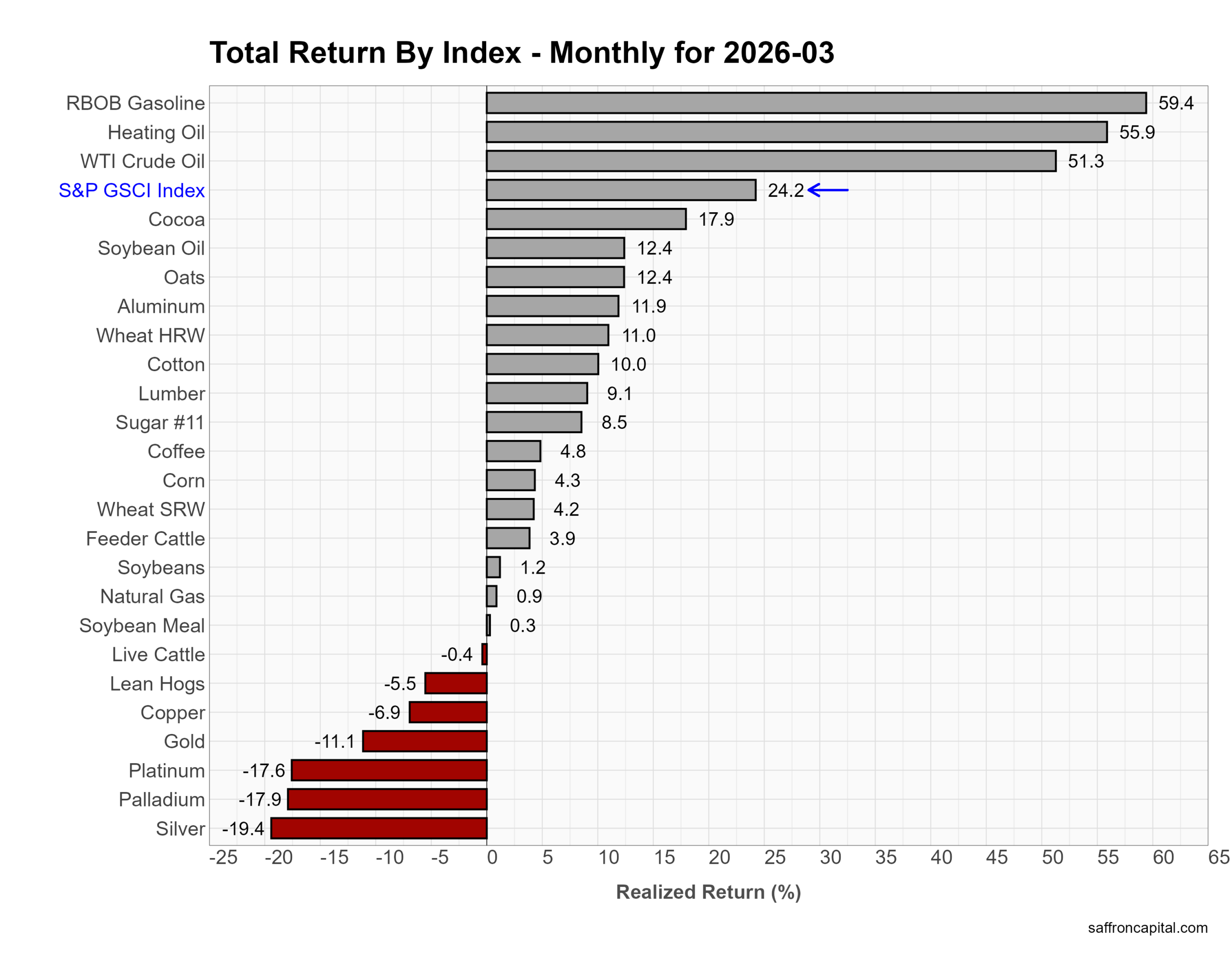 March was dominated by energy. The S&P GSCI surged 24.2%. RBOB gasoline jumped 59.4%, heating oil 55.9%, and WTI crude 51.3%. Agriculture was broadly higher, led by cocoa (+17.9%) and grains/oils in the low double digits. In contrast, metals lagged. Gold fell 11.1%, copper dropped 6.9%, and silver plunged 19.4%. Overall, a sharp energy rally drove the complex.