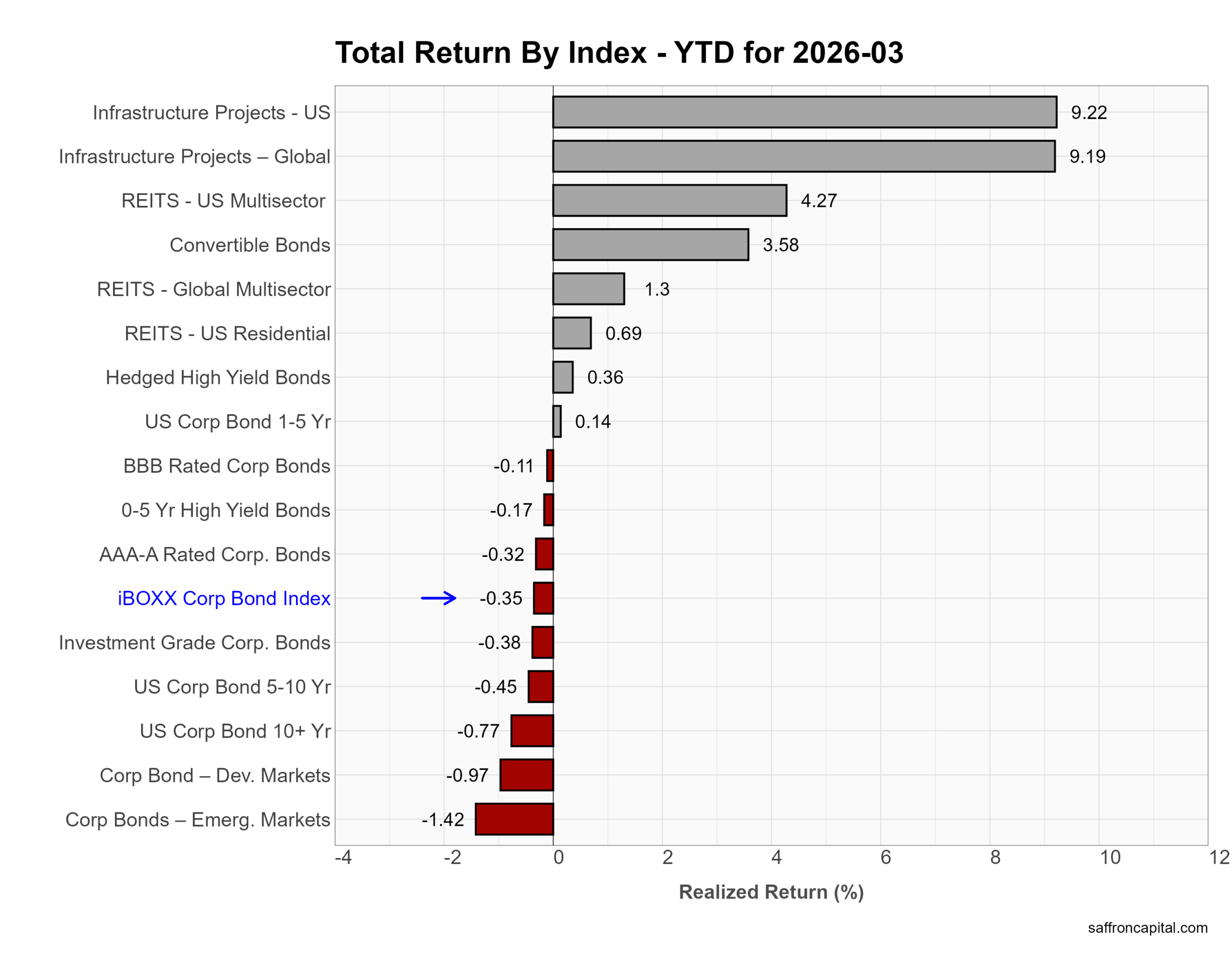 Year to date, leadership still sits with real assets. US infrastructure is up 9.22%, and global infrastructure +9.19%. US Multisector REITs gained 4.27%, while convertible bonds rose 3.58%. Core credit remains slightly negative, with the iBOXX Corporate Bond Index at -0.35% and most investment-grade segments below zero. High yield is roughly flat. In short, 2026 continues to favor asset-backed income and equity-linked credit over traditional duration-heavy corporates.