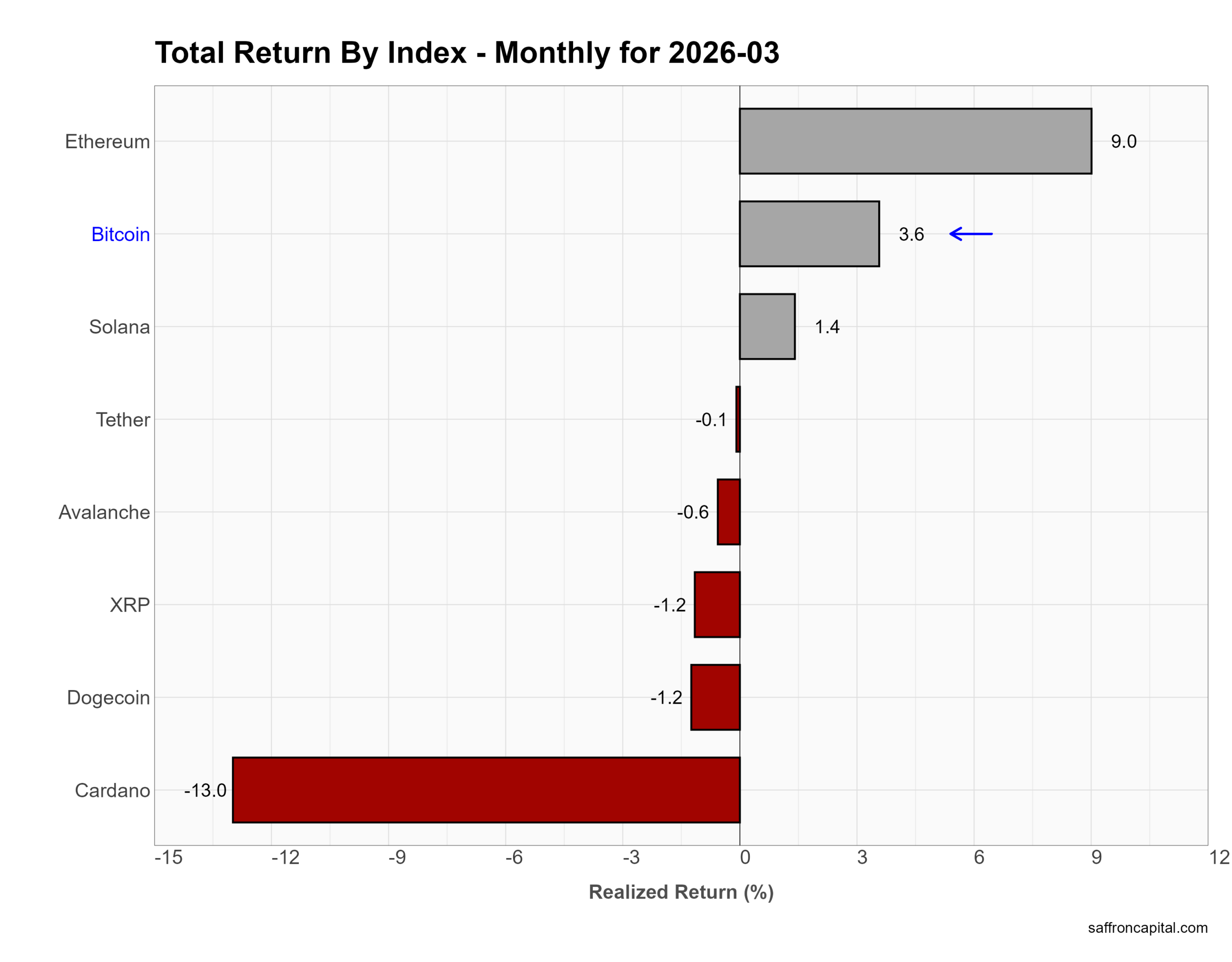 March was mixed but fragile. Ethereum led with a 9.0% gain, while Bitcoin rose 3.6% and Solana added 1.4%. Most altcoins lagged. XRP and Dogecoin fell 1.2%, Avalanche slipped 0.6%, and Cardano dropped 13.0%. Tether was flat. Overall, selective strength in majors failed to lift broader crypto.