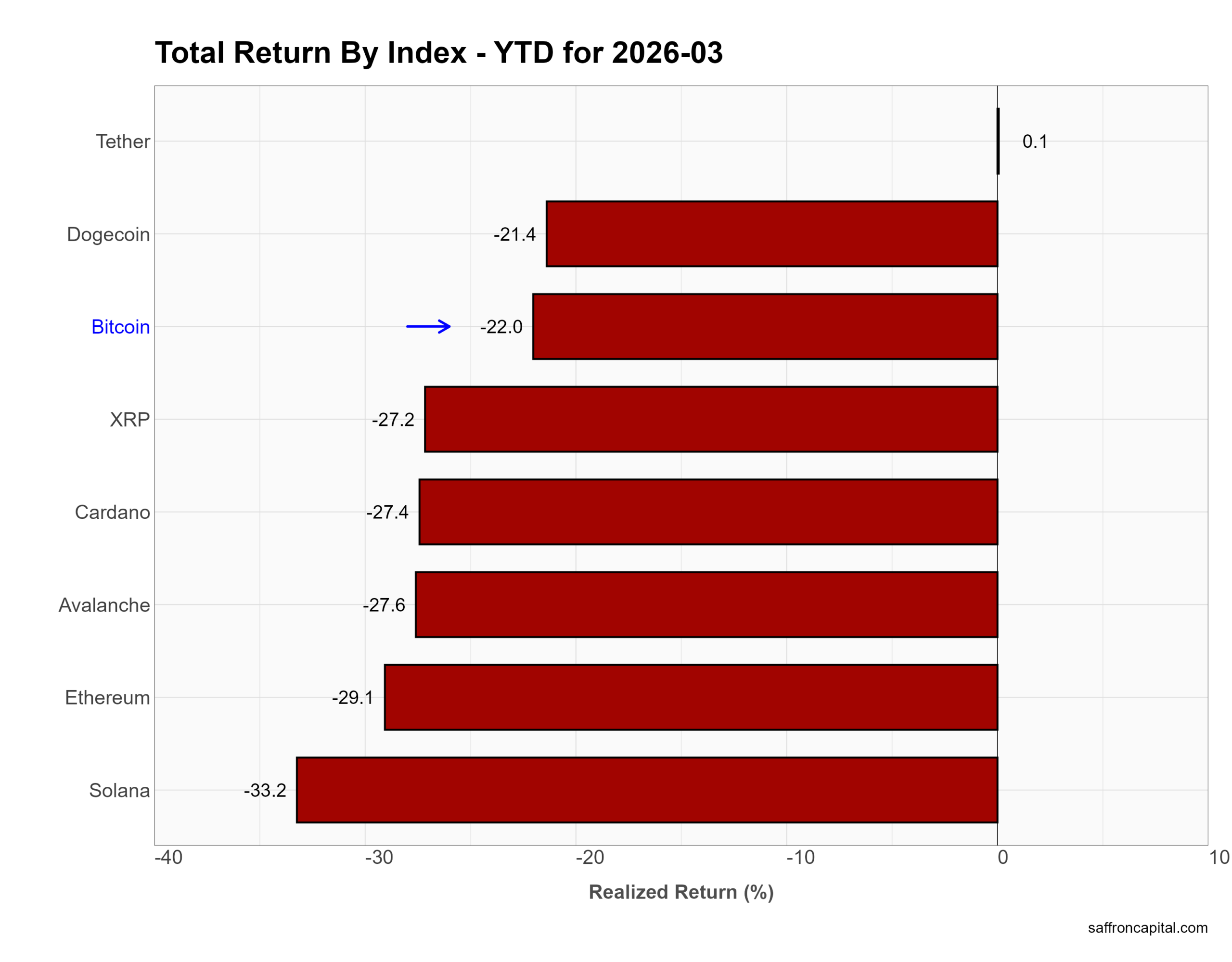 Year to date, losses remain steep. Bitcoin is down 22.0%. Ethereum (-29.1%) and Solana (-33.2%) lead the downside. Avalanche, Cardano, and XRP are all down roughly 27%, while Dogecoin has fallen 21.4%. Tether remains stable. In short, crypto is still in a drawdown phase despite short-term rebounds.