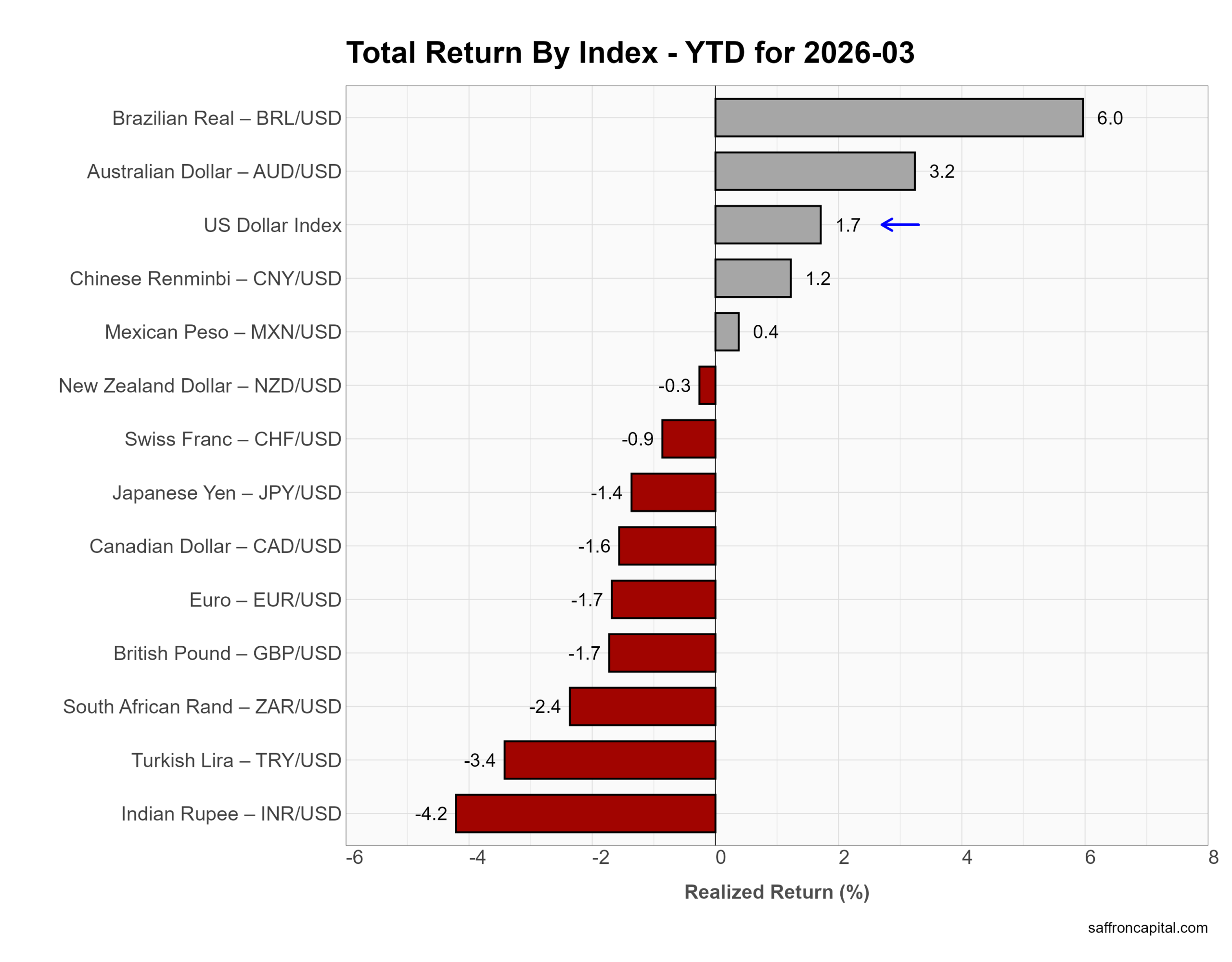 March saw broad dollar strength. The US Dollar Index rose 2.4%. Most currencies weakened, led by the South African rand (-6.2%), New Zealand dollar (-4.1%), and Mexican peso (-4.0%). The euro (-2.3%), pound (-1.9%), and yen (-1.8%) also declined. Overall, higher US yields and risk-off tone supported the dollar.