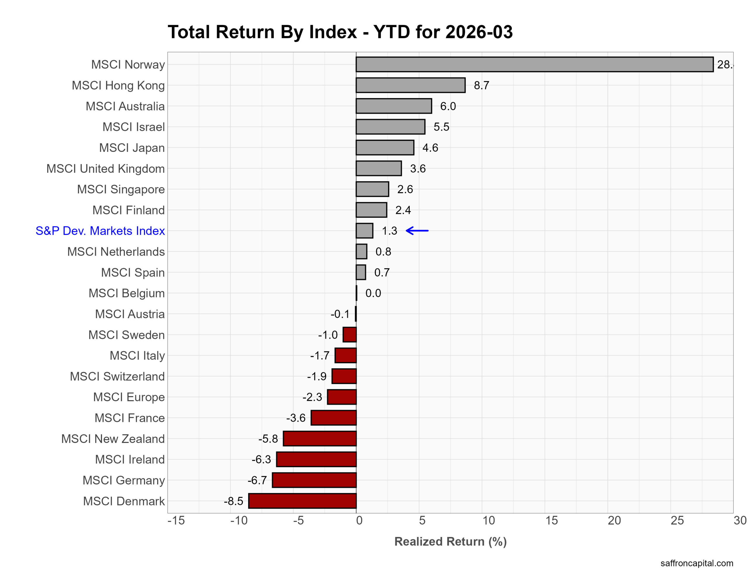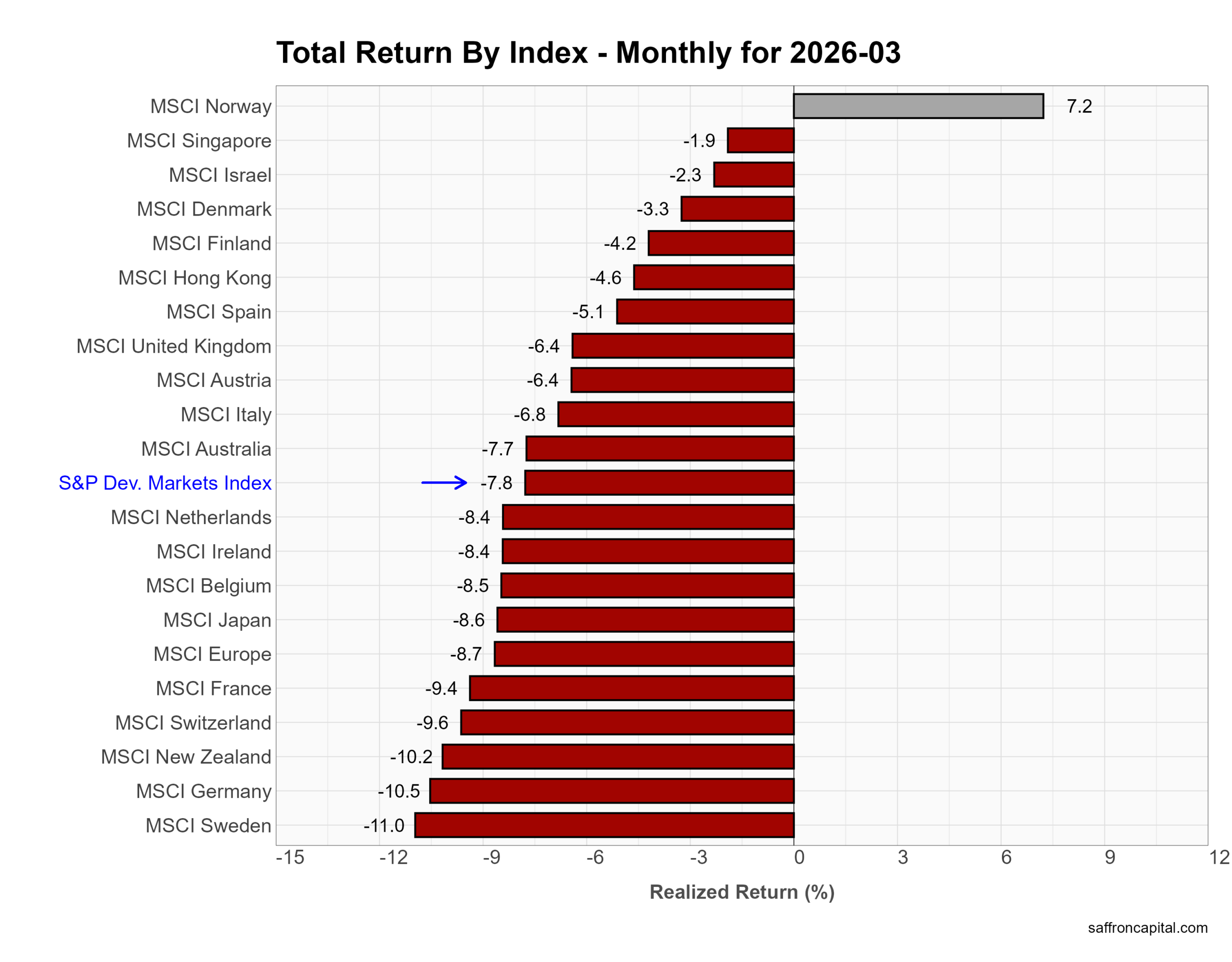 March returns show developed markets underperforming the U.S. First, the S&P Developed Markets Index fell -7.8%, lagging the S&P 500 at -5.1%. Losses were broad across Europe and Asia. Germany dropped -10.5%, France -9.4%, and Japan -8.6% as global growth fears and higher rates pressured equities. The U.K. declined -6.4%, while Australia fell -7.7%. Norway stood out as the lone gainer, rising +7.2% on energy strength. Overall, developed markets showed deeper downside sensitivity to the global macro shock than the U.S.