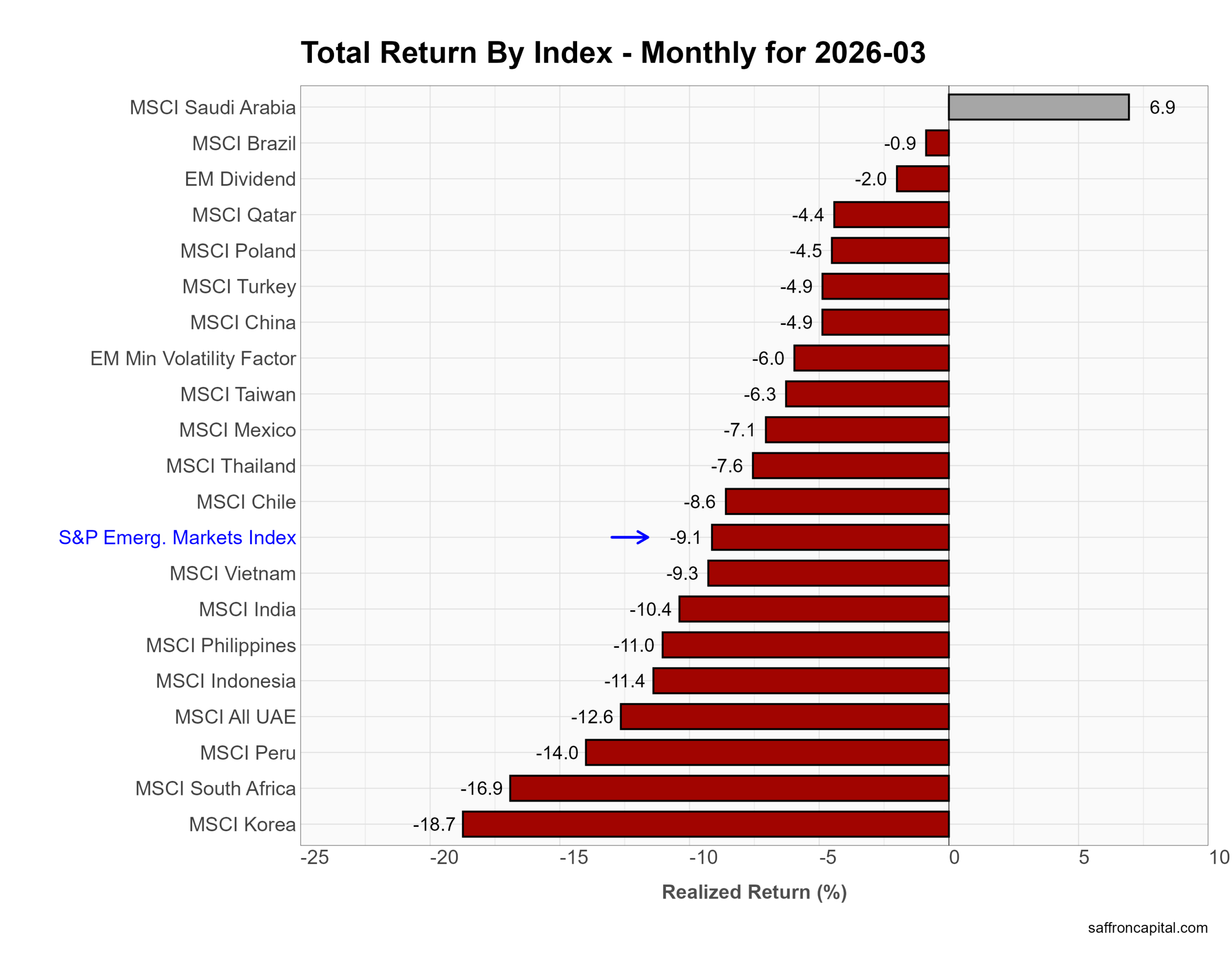 March returns show broad weakness across emerging markets. First, the S&P Emerging Markets Index fell -9.1%, underperforming the S&P 500 at -5.1%. Losses were widespread and severe. Korea dropped -18.7%, South Africa -16.9%, and Peru -14.0% as global growth fears and risk aversion intensified. Asia also weakened, with India down -10.4%, Indonesia -11.4%, and Vietnam -9.3%. China declined -4.9%, reflecting continued economic uncertainty. Saudi Arabia stood out as the lone gainer, rising +6.9% on energy strength. Overall, emerging markets showed high beta to the global selloff, with deep drawdowns across regions.
