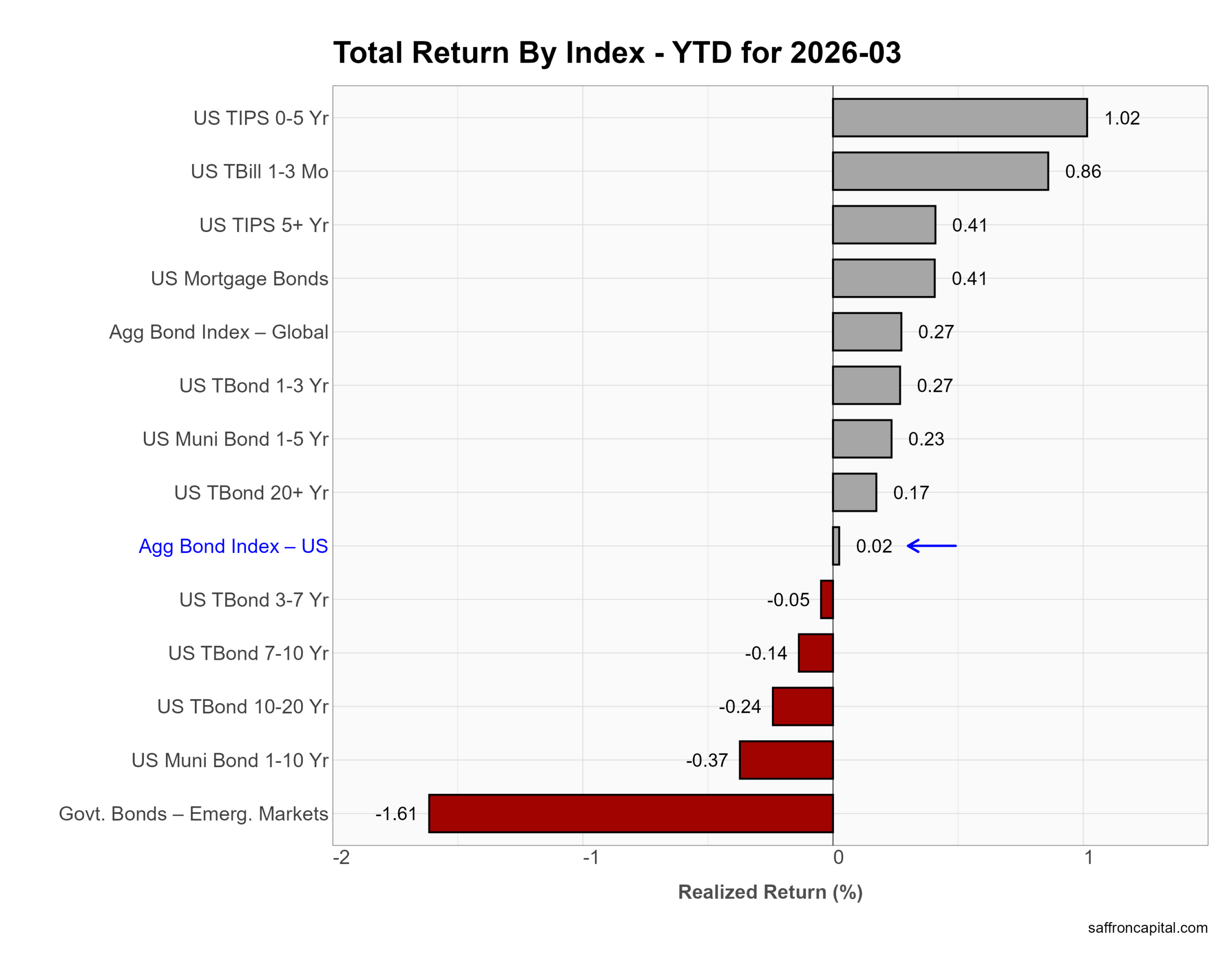 Year to date, returns are flat to modest despite March losses. 0–5 Year TIPS lead at +1.02%, followed by T-bills at +0.86%. Mortgage bonds and longer TIPS are up about +0.4%, while most Treasury maturities hover near zero or slightly negative. The US Aggregate Bond Index sits at +0.02%, reflecting limited carry offsetting price declines. In short, 2026 favors short duration and inflation protection over long-duration exposure.