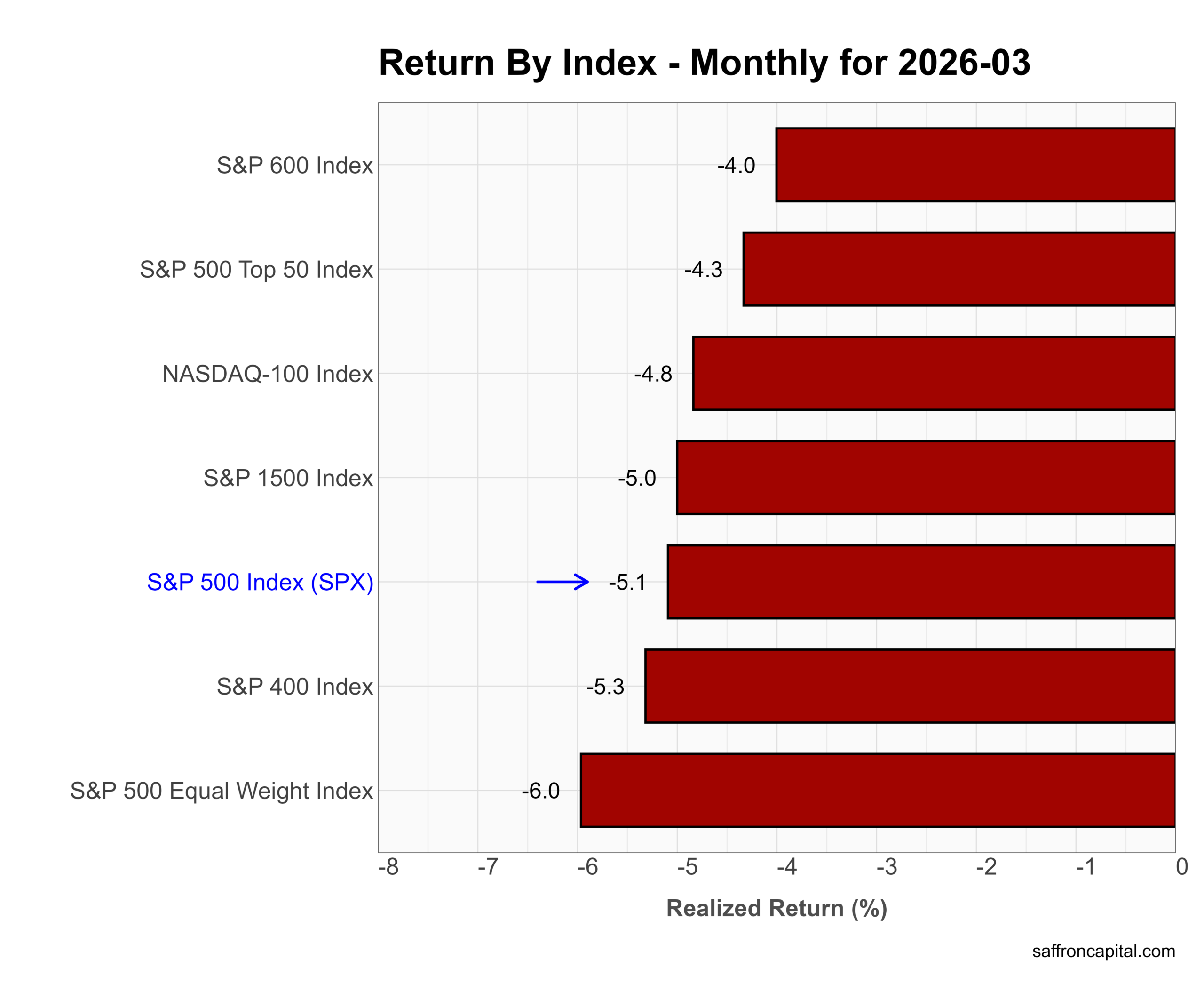 March delivered a broad-based equity selloff with no place to hide. First, mega caps led to the downside as the NASDAQ-100 fell -4.8% and the S&P 500 Top 50 dropped -4.3%. Meanwhile, the S&P 500 declined -5.1%, and broader indices performed even worse. The S&P 400 lost -5.3%, the S&P 600 fell -4.0%, and the Equal Weight S&P 500 dropped -6.0%, which confirms that weakness extended well beyond Big Tech. In short, March erased the prior rotation into breadth and reset risk across the entire equity complex.