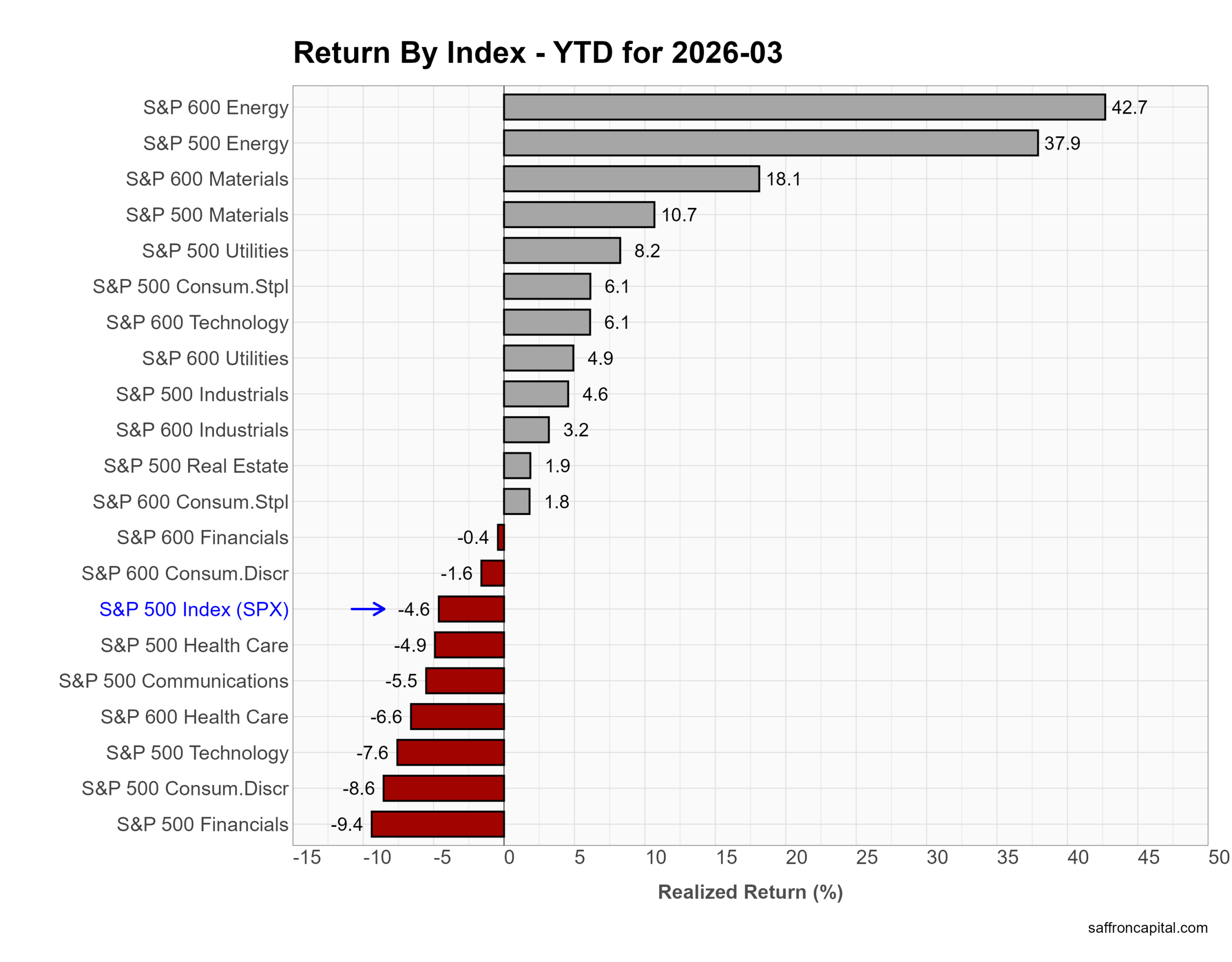 Year to date, leadership still leans toward smaller caps despite the March drawdown. The S&P 600 leads at +3.6%, followed by the S&P 400 at +2.6%, while the Equal Weight S&P 500 remains positive at +0.6%. In contrast, large-cap benchmarks lag. The S&P 500 sits at -4.6%, the NASDAQ-100 at -5.9%, and the S&P 500 Top 50 trails at -7.8%. Overall, 2026 still reflects a shift away from mega-cap concentration toward broader, more balanced market participation—even after March’s reset.