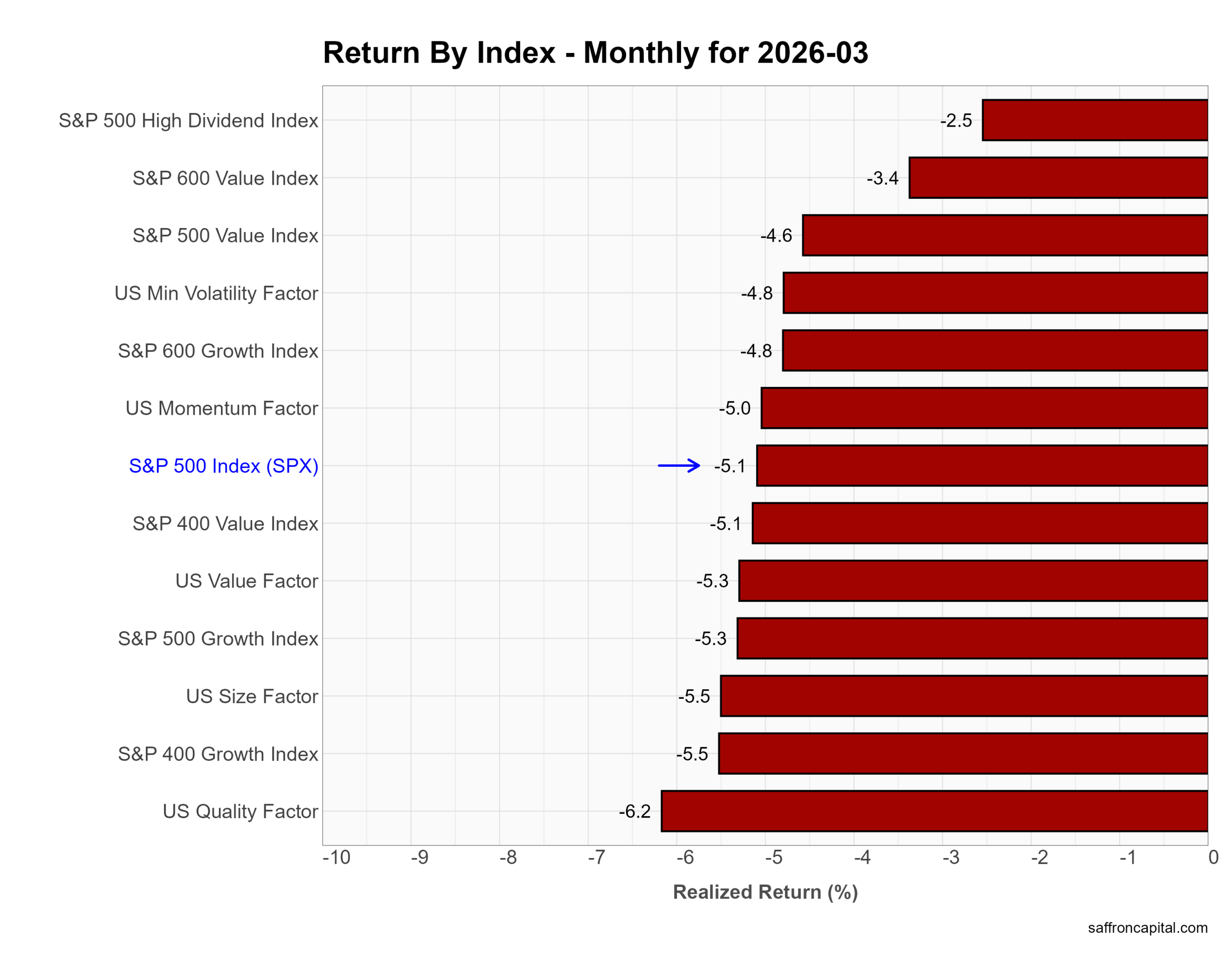 Factor portfolios group stocks by shared characteristics such as value, growth, momentum, or income to isolate specific return drivers. In March, all major factors declined, which signals broad de-risking rather than rotation. First, defensive strategies held up best. The S&P 500 High Dividend Index fell just -2.5%, outperforming the broader market. Meanwhile, Value showed relative resilience, with large-cap Value down -4.6% versus -5.3% for Growth. However, higher-beta exposures lagged. Momentum dropped -5.0%, Size fell -5.5%, and Quality underperformed at -6.2%. In short, investors reduced risk across both growth and factor tilts, with only income strategies offering partial downside protection.