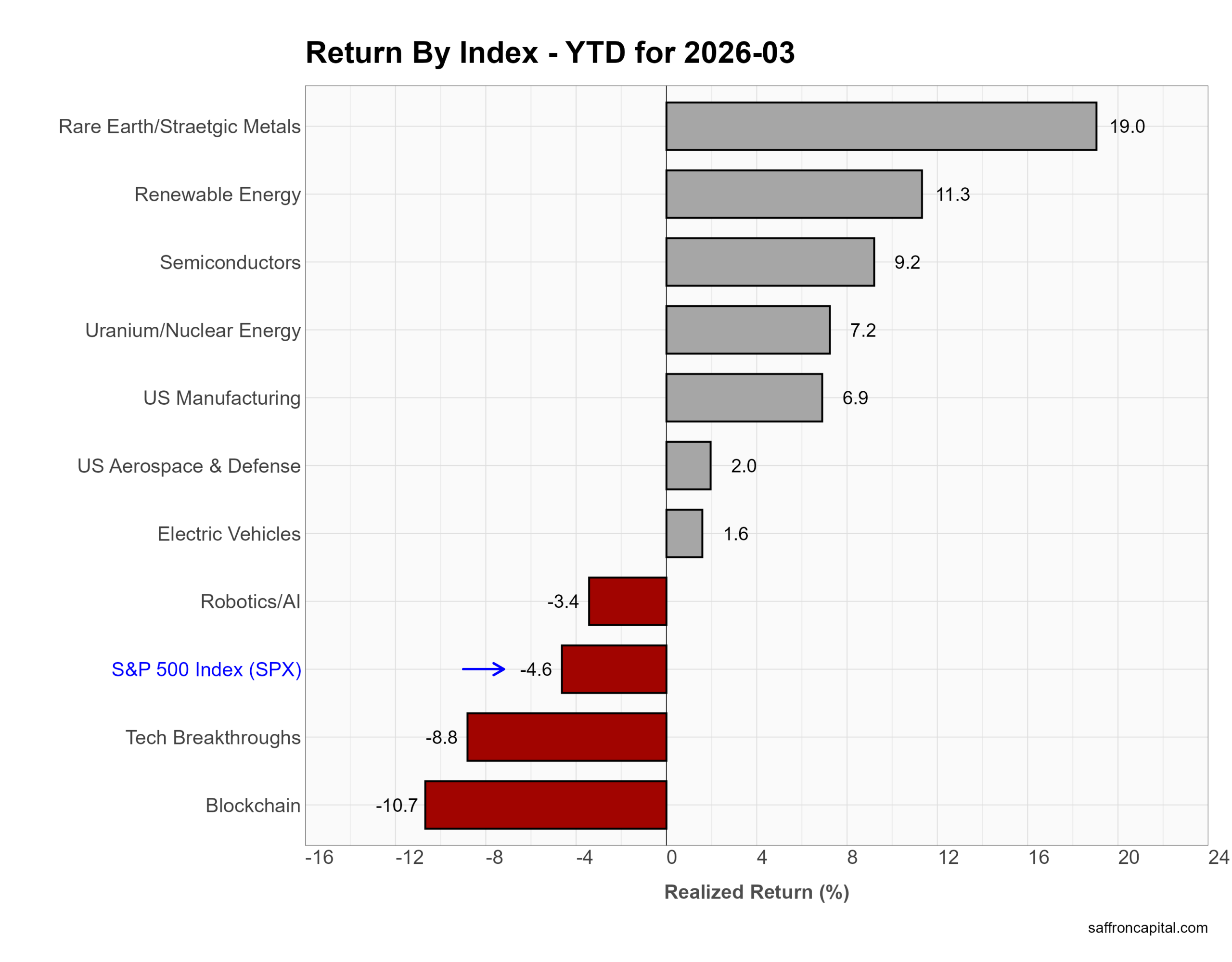 Year to date, leadership still favors real assets and strategic supply chains. Rare Earth/Strategic Metals lead at +19.0%, followed by Renewable Energy (+11.3%) and Semiconductors (+9.2%). Uranium/Nuclear Energy (+7.2%) and US Manufacturing (+6.9%) also show strength. In contrast, speculative tech themes lag. Blockchain is down -10.7%, and Tech Breakthroughs fell -8.8%. Overall, 2026 continues to reward tangible, policy-driven themes over high-beta innovation trades.